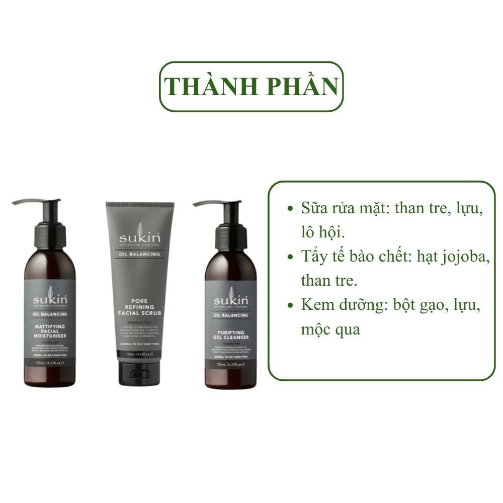 Sukin Kem Làm Sạch Tế Bào Chết Cân Bằng Dầu Oil Balancing Pore Refining Facial Scrub 125ml cân bằng dầu tinh than tre dành cho da mặt có thành phần chính là than hoạt tính có khả năng làm sạch da mặt của bạn một cách an toàn và hiệu quả cao, không nhưng hoạt động trên bề mặt da mà còn hút bụi bẩn, tạp chất nằm sâu trong lỗ chân lông mà mắt thường không thể nhìn thấy được. Ngoài ra, tinh than tre còn có tác dụng kiềm dầu và kiểm soát nhờn, loại bỏ dầu thừa, đem lại cho làn da cảm giác thoải mái, dễ chịu. Kết hợp với chiết xuất dầu từ cây liễu non (Willowherb), hồng trà Nam Phi (Rooibos) và dừa, ngoài chức năng chính làm sạch da còn có tác dụng cân bằng sắc tố da, cân bằng độ ẩm, giúp bảo vệ da khỏi bị mụn tấn công và ngăn ngừa mụn trở lại, cho bạn một làn da sáng mịn và rạng ngời hơn.
