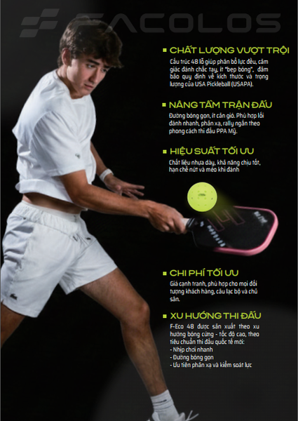 Bóng Pickleball Facolos 48 lỗ là phiên bản nâng cấp từ dòng F-ECO, được phát triển dành cho người chơi phong trào, CLB và các cụm sân có tần suất sử dụng cao. Với thiết kế 48 lỗ tiêu chuẩn, bóng cho độ nảy tốt hơn so với bóng 40 lỗ, quỹ đạo bay ổn định, cảm giác đánh chắc tay và dễ kiểm soát trong suốt quá trình tập luyện hay thi đấu.