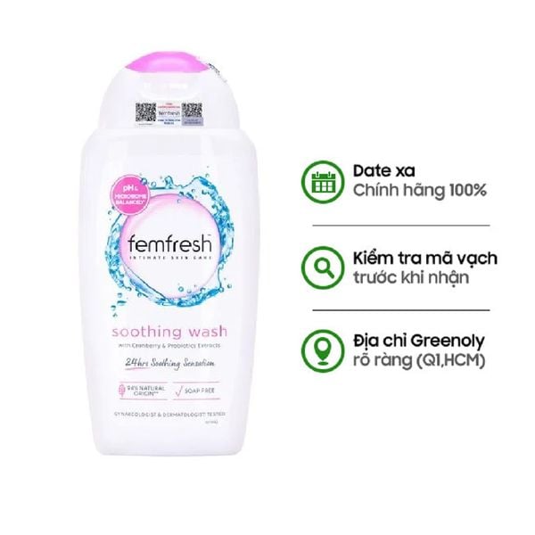 Nước rửa phụ khoa Femfresh Soothing Wash dạng gel trong với mùi thơm nhẹ nhàng, giúp khử mùi hôi “cô bé”, làm sạch và duy trì môi trường lí tưởng “cô bé”. Gel rửa vệ sinh phụ nữ Femfresh 250ml ngăn ngừa và hỗ trợ điều trị các bệnh phụ khoa, cân bằng độ pH, không gây dị ứng, an toàn sử dụng mỗi ngày.