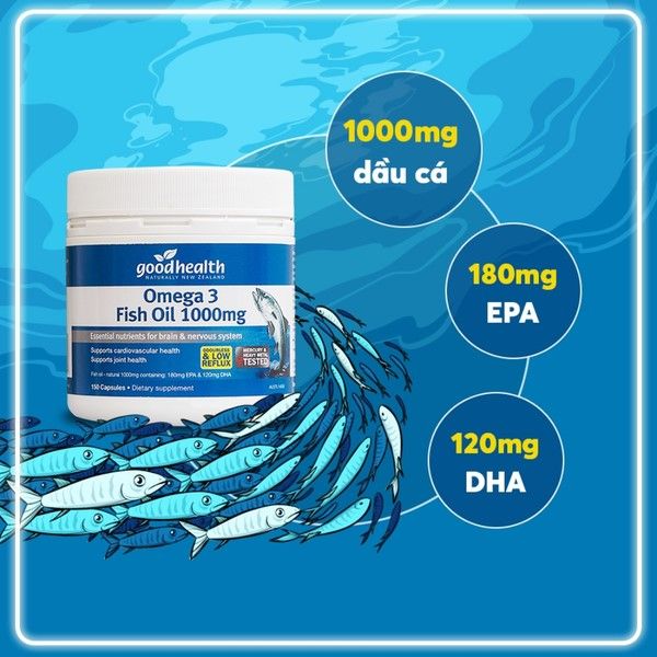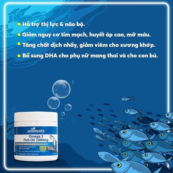 Là một sản phẩm bổ sung chất dinh dưỡng chứa dầu cá Omega 3, được sản xuất bởi thương hiệu Goodhealth. Sản phẩm này nhằm cung cấp một nguồn cung cấp quan trọng của các axít béo Omega 3, bao gồm EPA (axít eicosapentaenoic) và DHA (axít docosahexaenoic), có lợi cho sức khỏe tim mạch và não bộ.