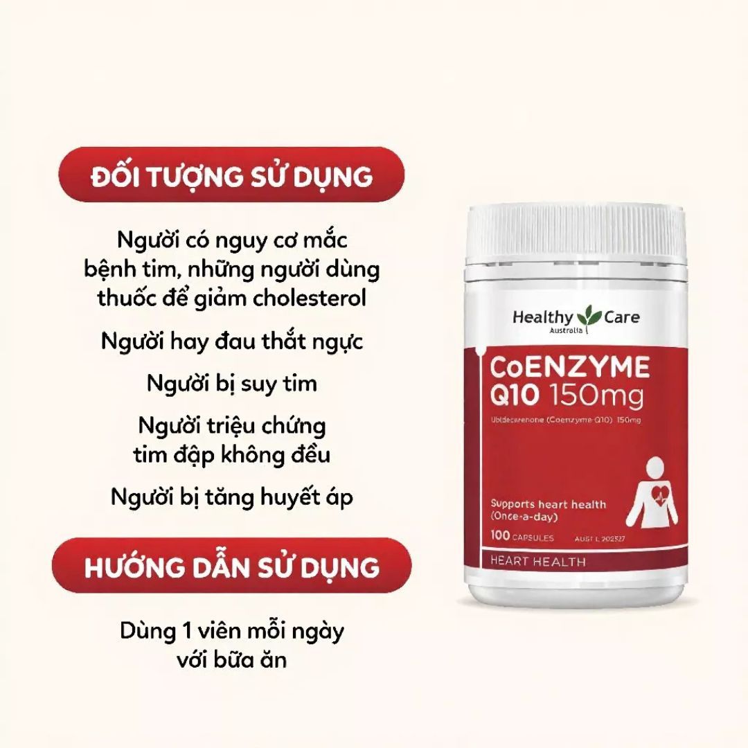 Viên Uống Coenzyme Q10 150Mg Healthy Care là thực phẩm chức năng hỗ trợ sức khỏe tim mạch cho nhiều lứa tuổi, đặc biệt là độ tuổi trung niên và cao niên. Hàm lượng Q10 cao giúp duy trì và tăng cường chức năng tim mạch hiệu quả, hỗ trợ sức khỏe ổn định, hạn chế các vấn đề về chức năng tim: thở gấp, thở dốc, mệt mỏi.