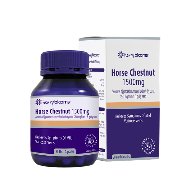 Henry Blooms Viên Uống Hỗ Trợ Giảm Giãn Tĩnh Mạch Hạt Dẻ Ngựa Horse Chestnut 1500mg 30 Viên giúp giảm các triệu chứng giãn tĩnh mạch nhẹ bao gồm đau chân và nặng nề. Cũng giúp giảm sưng chân và đau liên quan đến chứng giãn tĩnh mạch nhẹ. Hạt dẻ ngựa theo truyền thống được sử dụng trong Y học thảo dược phương Tây để giảm các triệu chứng của bệnh trĩ, giúp kiểm soát căng cơ và giảm chuột rút ở chân.