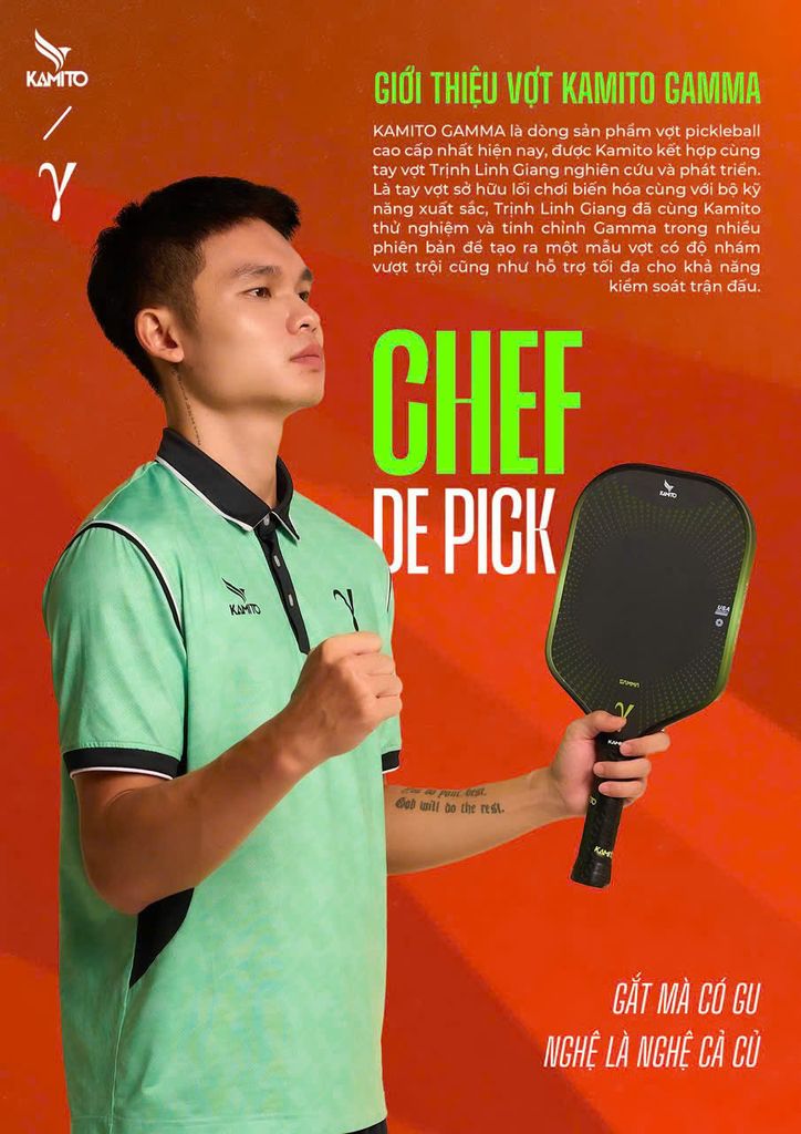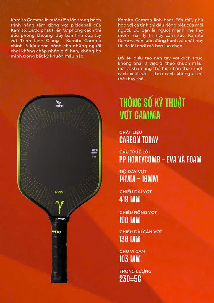 Kamito Gamma là dòng vợt pickleball thuộc phân khúc cao cấp từ nhà Kamito, được nghiên cứu và phát triển dựa trên phong cách thi đấu đầy bản lĩnh và phóng khoáng của Trịnh Linh Giang - Đương kim vô địch nội dung “Đơn Nam” giải Panas Malaysia Open 2025 thuộc PPA Tour Asia. Kamito Gamma là dòng vợt hướng đến lối chơi linh hoạt, phù hợp với cá tính thi đấu của nhiều người chơi, thể hiện được tinh thần không bó mình trong một khuôn khó nhất định, bước ra khỏi giới hạn để tỏa sáng.