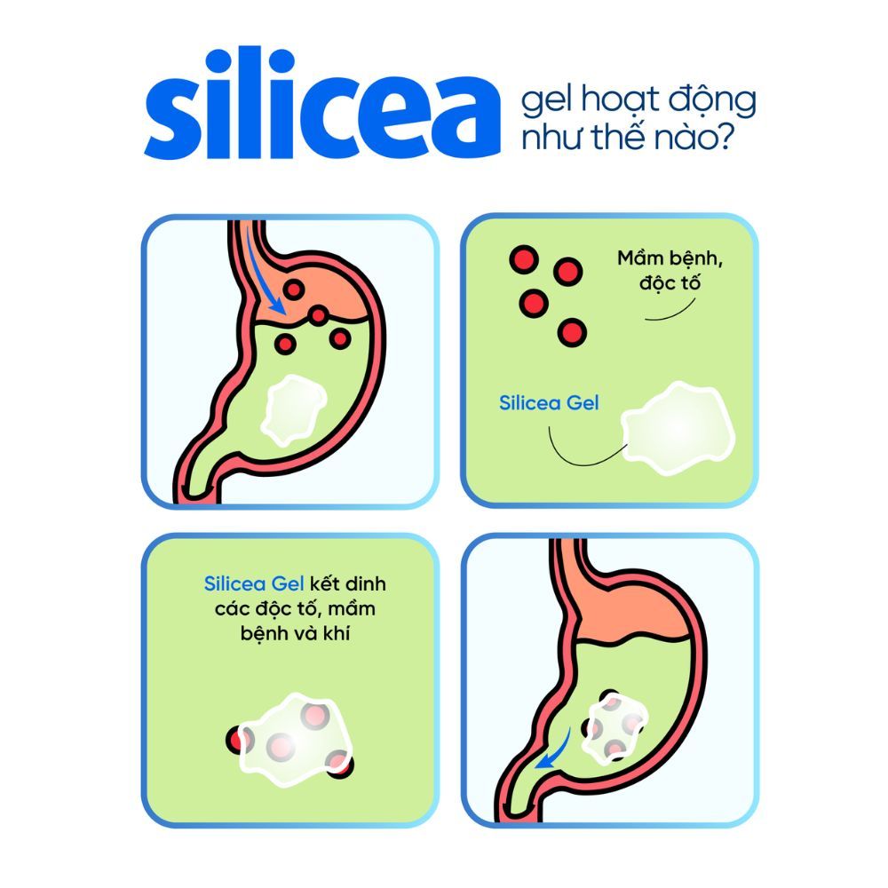 Với cơ chế KHÁC HOÀN TOÀN các sản phẩm hiện có trên thị trường Việt Nam, sử dụng công nghệ mới. Silicea dựa vào khả năng hấp phụ, kết dính vượt trội của Silica gel. Silicea hoạt động như một miếng bọt biển khi đi vào hệ thống tiêu hóa, kết dính các mầm bệnh, vi khuẩn và độc tố của chúng rồi đưa ra ngoài theo cơ chế bài tiết tự nhiên của cơ thể.