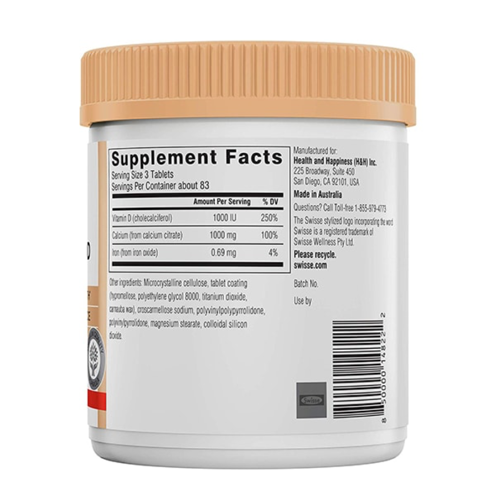 Swisse Calcium + Vitamin D là viên uống hỗ trợ bổ sung hàm lượng canxi và vitamin D3 cần thiết để hỗ trợ duy trì sự chắc khỏe của xương, răng, và hỗ trợ tốt cho người có nguy cơ loãng xương. Sản phẩm bổ sung canxi từ thực phẩm hàng ngày như: sữa, cá mòi, ngũ cốc, đậu phụ, cải xoăn, đậu bắp, hạnh nhân,...nên không gây lắng cặn, không gây tác dụng phụ cho người dùng.