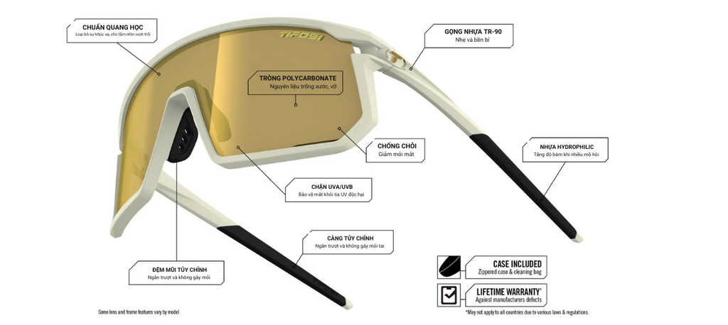 - Tròng kính chống sương mù, chống vỡ, bảo vệ 100% UVA/UVB.