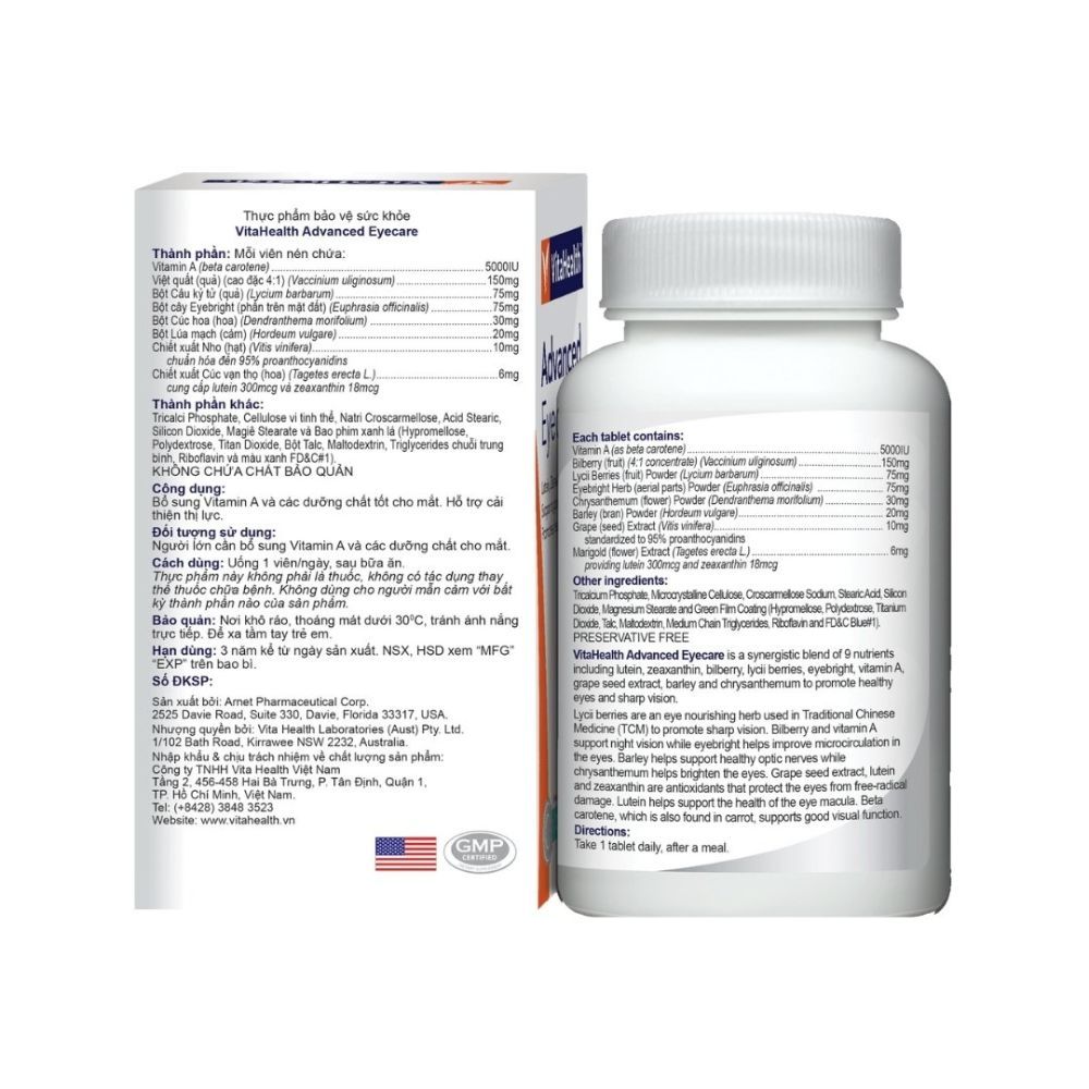 Viên uống bổ mắt VitaHealth Advanced Eyecare 30 viên có bảng thành phần như sau: