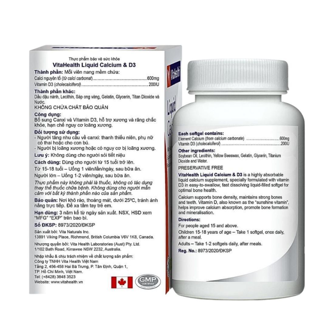 Viên uống bổ sung Canxi và Vitamin D3 VitaHealth Liquid Canxi & D3 là dòng sản phẩm bổ sung canxi cùng vitamin D3, vitamin K2, các chất thăng hóa xương đảm bảo sức khỏe, biếng học, biếng ăn, biến hóa xương khớp ở người cao tuổi.
