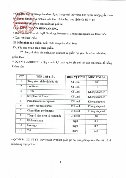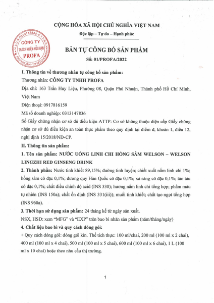 Nước tinh khiết 89,15%; chiết xuất Linh Chi 1%; Hồng Sâm cô đặc 0,1%; Đương quy Hàn Quốc cô đặc 0,1%; Xà Sàng cô đặc 0,1%; Táu Tàu cô đặc 0,1%, đường tinh luyện; chất điều chỉnh độ acid (INS 330); hương nấm Linh Chi tổng hợp; phẩm màu tự nhiên (INS 150a); chất ổn định (INS 331 (iii)); muối tinh khiết, chất tạo ngọt tổng hợp (INS 960a).