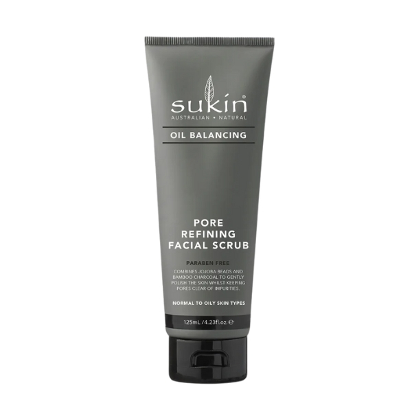 Sukin Kem Làm Sạch Tế Bào Chết Cân Bằng Dầu Oil Balancing Pore Refining Facial Scrub 125ml cân bằng dầu tinh than tre dành cho da mặt có thành phần chính là than hoạt tính có khả năng làm sạch da mặt của bạn một cách an toàn và hiệu quả cao, không nhưng hoạt động trên bề mặt da mà còn hút bụi bẩn, tạp chất nằm sâu trong lỗ chân lông mà mắt thường không thể nhìn thấy được. Ngoài ra, tinh than tre còn có tác dụng kiềm dầu và kiểm soát nhờn, loại bỏ dầu thừa, đem lại cho làn da cảm giác thoải mái, dễ chịu. Kết hợp với chiết xuất dầu từ cây liễu non (Willowherb), hồng trà Nam Phi (Rooibos) và dừa, ngoài chức năng chính làm sạch da còn có tác dụng cân bằng sắc tố da, cân bằng độ ẩm, giúp bảo vệ da khỏi bị mụn tấn công và ngăn ngừa mụn trở lại, cho bạn một làn da sáng mịn và rạng ngời hơn.