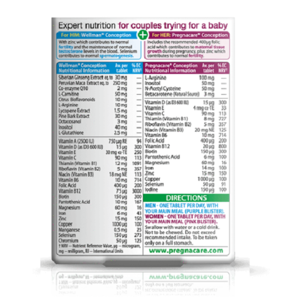 Vitabiotics Pregnacare Him & Her Conception là một sản phẩm viên uống hỗ trợ tăng khả năng thụ thai dành cho cả nam và nữ. Được phát triển bởi Vitabiotics, một công ty dược phẩm hàng đầu tại Vương quốc Anh, Pregnacare Him & Her Conception được thiết kế đặc biệt để cung cấp các dưỡng chất quan trọng và hỗ trợ sức khỏe giúp tăng cường khả năng thụ thai cho cả hai vợ chồng.